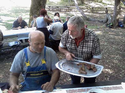 Con la camminata di sabato 8 settembre si è conclusa la stagione 2012 delle escursioni organizzate da Oltr'Alpe. Altre iniziative saranno effettuate estemporaneamente, al di fuori da un calendario programmato, e provvederemo a darne notizia in anticipo sul nostro sito. L'ultima camminata si è svolta, come è tradizione, lungo i sentieri dell'Alpe e si è conclusa, intorno alle 12,30, in tei prè d'la radeccia, dove si è potuto consumare un pranzo, ottimo e abbondante, costituito da due minestre, grigliata mista con contorno di patatine fritte, dolci assortiti e vino a volontà. |